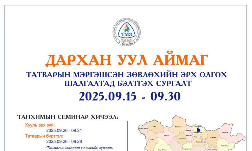ТМЗН-ийн 2025 оны сүүлийн хагас жилийн сургалт, шалгалтын төлөвлөгөөт хуваарийн дагуу ТМЗ-ийн эрх олгох шалгалтад бэлтгэх цахим, танхимын хосолсон хэлбэрийн сургалтыг ДАРХАН-УУЛ АЙМАГ-т 9 дүгээр сарын 15-с 9 дүгээр...